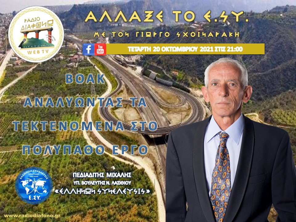 Ο ΚΥΡΙΟΣ ΠΕΔΙΑΔΙΤΗΣ ΜΙΧΑΛΗΣ, ΥΠΟΨΗΦΙΟΣ ΒΟΥΛΕΥΤΗΣ ΝΟΜΟΥ ΛΑΣΙΘΙΟΥ ΜΕ ΤΗΝ ΕΛΛΗΝΩΝ ΣΥΝΕΛΕΥΣΙΣ, ΚΑΛΕΣΜΕΝΟΣ ΣΤΗΝ ΕΚΠΟΜΠΗ ΤΟΥ ΡΑΔΙΟ ΔΙΑΦΩΝΩ "ΑΛΛΑΞΕ ΤΟ Ε.ΣΥ." ΜΕ ΤΟΝ ΓΙΩΡΓΟ ΣΧΟΙΝΑΡΑΚΗ.
